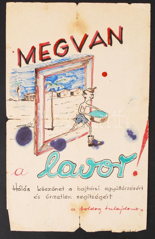 Description: II. világháborúban a Don-kanyari harcokból visszatért veterán tizedes ajándéka: "Megvan a lavor, Hálás köszönet a bajtársi együttérzésért és önzetlen segítségért!" felirattal
