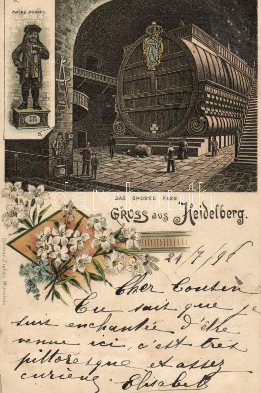 1898 Heidelberg, The big barrel, statue of Zwerg Perkeo, floral, litho (fa)