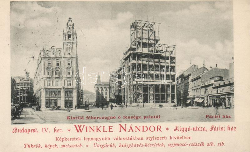 https://www.darabanth.com/en/207-Online-auction/207.0/Postcards/Hungary~5/Budapest-V-Klotild-palotak-epites-alatt-Winkle-Nandor-kepkeretezo-kereskedese-a-Kigyo-ut~II844637