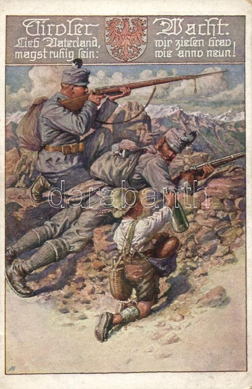 'Tiroler Wacht.' / 'Tyrolean alpinist guard' K.u.K. military, coat of arm, Deutscher Schulverein advertisement, artist signed (small tear)