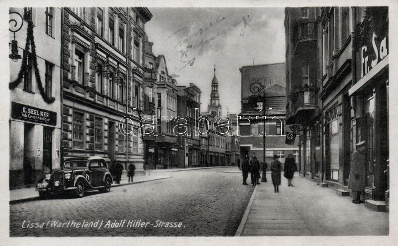 Lissa (Wartherland), Adolf Hitler square, E. Seeliger's shop, aut...