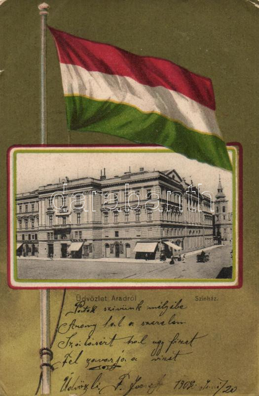 Arad, színház, magyar zászló / theatre, Hungarian flag litho (small te...