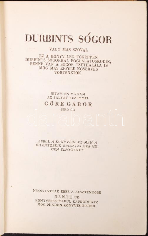 Gárdonyi Géza: Göre Gábor: Durbnist sógor Bp., é.n. Dante. Mühlbeck Károly szövegközti illusztrációival, kiadói festett, aranyozott egészvászon kötésben