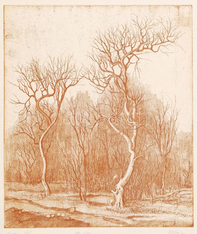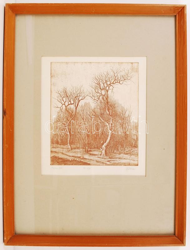 Sipos István (1945-): Kopasz fák. Rézkarc, papír, jelzett, üvegezett k...