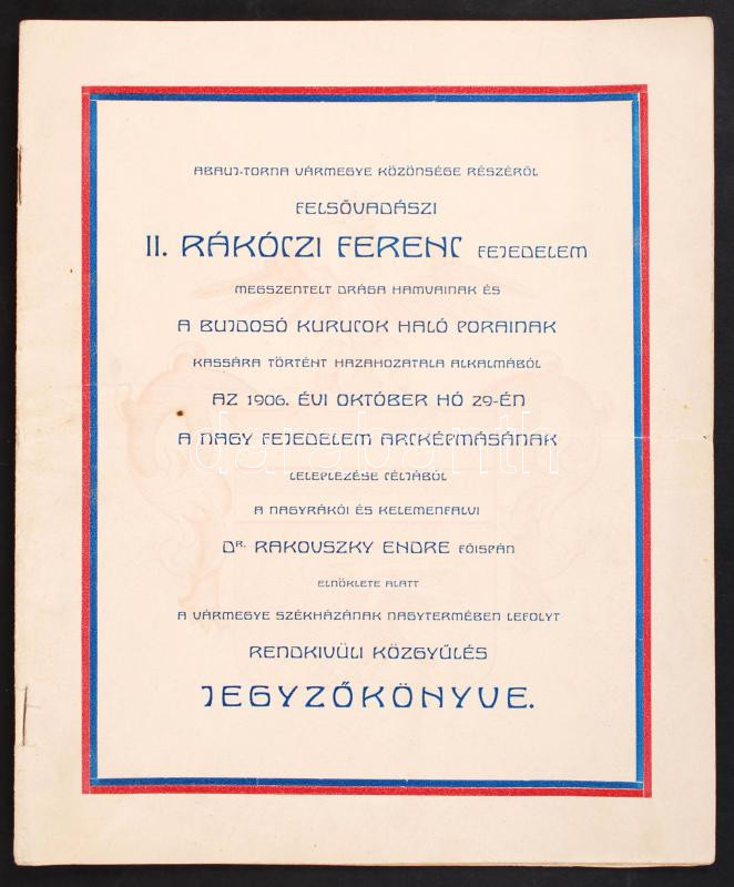 1906 Abauj-Torna vármegye részéről II. Rákóczi Ferenc fejedelem hamvainak hazahozatala alkalmából lefolyt rendkívüli közgyűlés jegyzőkönyve 24p.