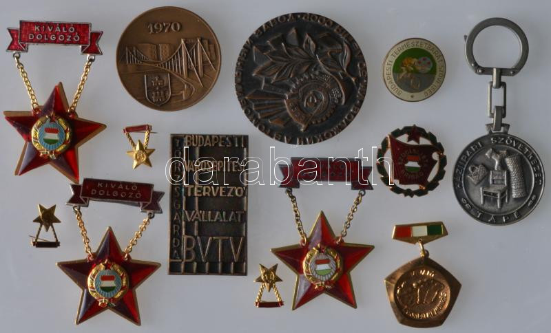 16db szocialista kitüntetés, emlékérem, plakett és jelvény, benne "Munka Érdemrend ezüst fokozata" dÃsztokban, "Kiváló Dolgozó" kitüntetések, a "Budapest VárosépÃtési TervezÅ‘ Vállalat" plakettjei T:vegyes