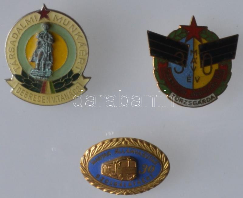Description: ~1970-1980. "Magyar Államvasutak Szolgálatáért" 30 év után járó aranyozott, zománcozott jelvény + "MÁV - Debreceni Járműjavító Ü.V. Törzsgárda" 30 év után járó zománcozott jelvény + "Társadalmi Munkáért - Debreceni Városi Tanács" fém jelvény, együtt tokban T:2