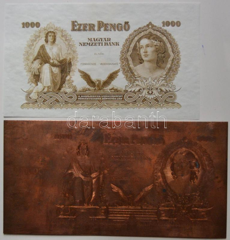 Hungary 1943. 1000 Pengő officially unissued banknote reprint + officially unissued banknote positive printing plate. Rare! C:AU