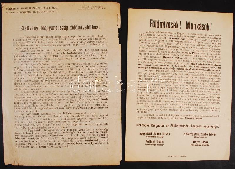 Description: cca 1919 Az Országos Kisgazda- és Földmívespárt központi vezetősége és a Keresztény Magyarország Egyesület Pártjai által kiadott 2 db politikai szórólap