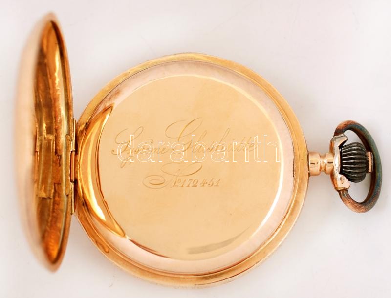 Systeme Glashutte arany (Au.) 14 k zsebóra, másodpercmutatós, jelzett, jól működik, számlapon apró folt és hajszálrepedés, fedelén gravírozott lovas jelenettel, sorszáma: 172451, bruttó:93 g /Glashutte Systeme Vintage 14K Gold Mechanical Pocket Watch, signed, small cracked on the dial, works well