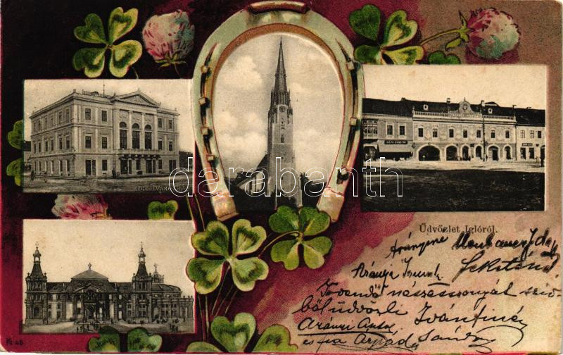 1900 Igló, Városház, takarékpénztár; lóherés képeslap, kiadja Matz G. / town hall, bank; clover litho (fl)