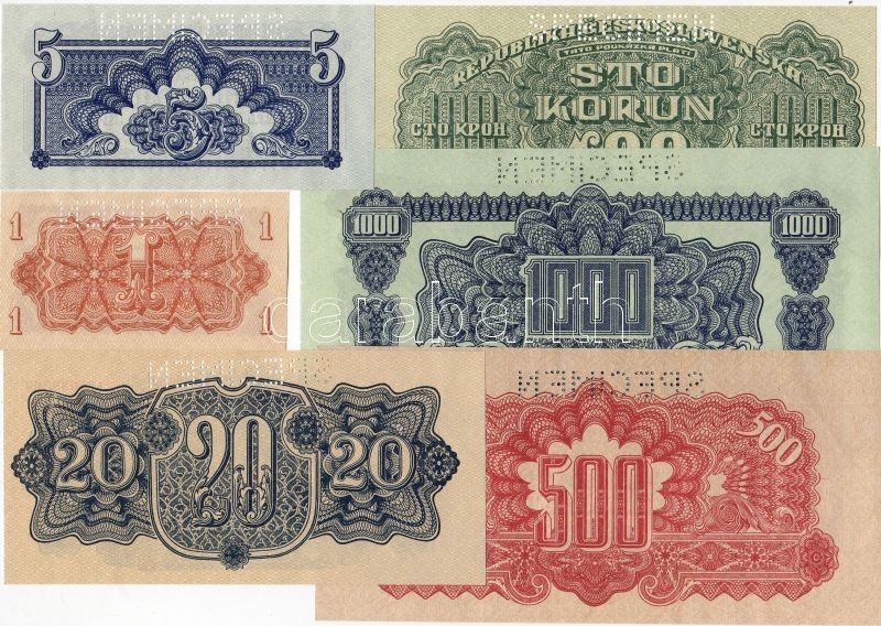 Csehszlovákia 1945 1K, 5K, 20K, 100K, 500K, 1000K "Moszvai" kadás "Specimen" lyukasztással T:I