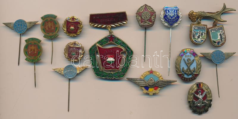 14db vegyes magyar és külföldi kitüntetés, jelvény és kitűző a szocialista korszakból, közte ~1970-1980. "A Vállalat Kiváló Brigádja" kitüntetés sérült tokban, NDK "Társaság a Sportért és a Techikáért (Gesellschaft för Sport und Technik)" zománcozott, aranyozott fém jelvény T:vegyes