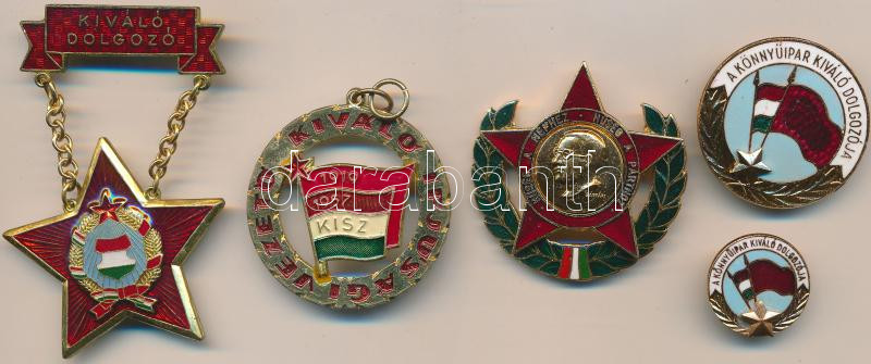 ~1960. "Hűség a néphez, hűség a párthoz" zománcozott kitüntetés dísztokban. Szign.: Ságvári + "Kiváló Ifjúsági Vezető" zománcozott jelvény mellszalag nélkül + ~1970-1980. "A Könnyűipar Kiváló Dolgozója" zománcozott kitüntetés miniatűrrel dísztokban + "Kiváló Dolgozó" zománcozott kitüntetés T:1,2