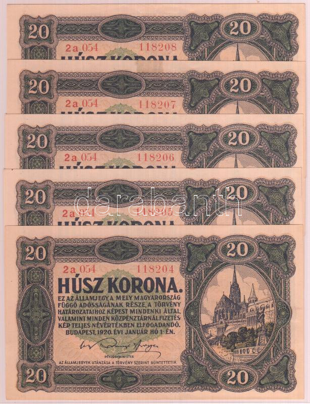 1920. 20K (5x) egymásutáni sorszámmal T:I- egyiken folt, hajtatlanok