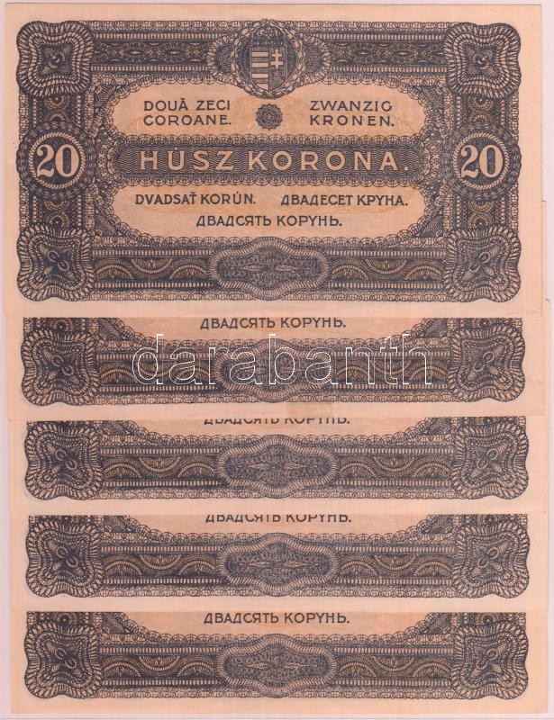 https://www.darabanth.com/en/210-Online-auction/210.0/Numismatics/Hungarian-Banknotes~99/1920-20K-5x-egymasutani-sorszammal-TI-egyiken-folt-hajtatlanok~II868292