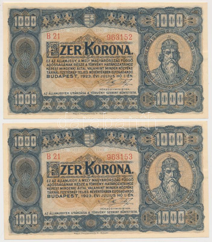1923. 1000K "Magyar Pénzjegynyomda" (2x) egymásutáni sorszámmal T:I- h...