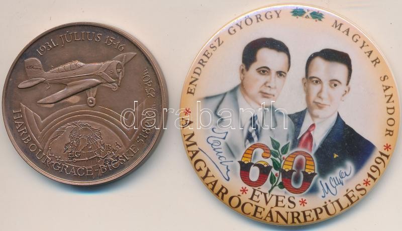 Bozó Gyula (1913-2004) 1991. "60 éves a magyar óceánrepülés Endresz György - Magyar Sándor / Harbour Grace - Bicske" Br emlékérem (43mm) + 1991. "60 éves a magyar óceánrepülés / Endresz György, Magyar Sándor" szÃnes kitűzÅ‘ T:2