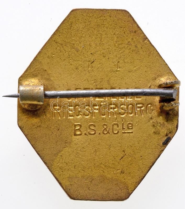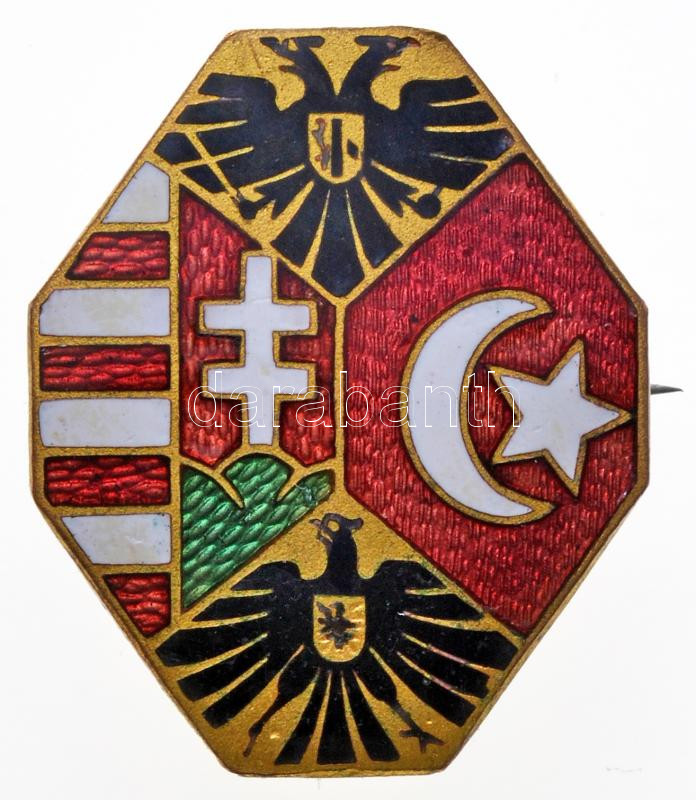 Osztrák-Magyar Monarchia ~1914. Aranyozott, zománcozott fém jelvény osztrák, magyar és török címerrel, hátoldalon "RS OFFIZIELLE KRIEGSFÜSORGE, B.S.& Cie" (24x20mm) T:2