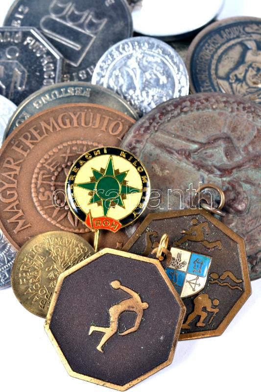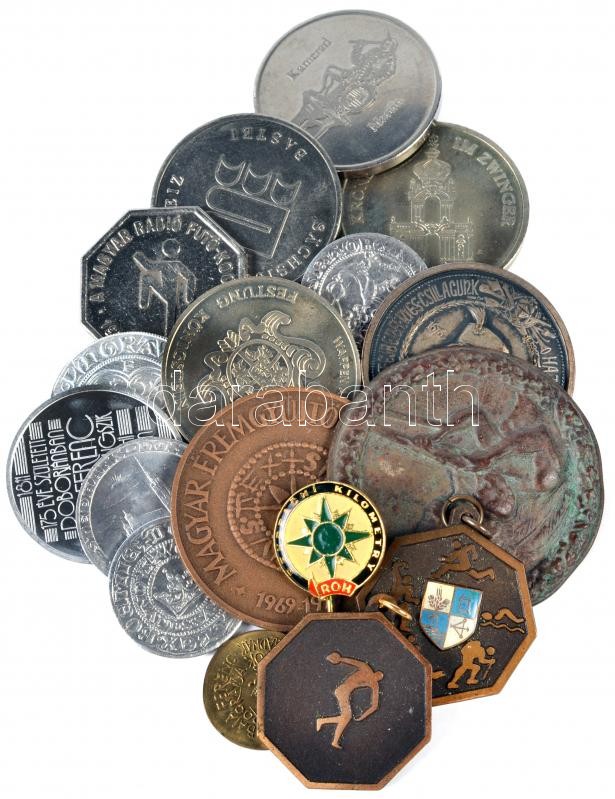 Description: 17db vegyes magyar és külföldi emlékérem és kitűző, közte "Festung Königstein", "1969-1979 Magyar Éremgyűjtők Egyesülete" , 1974. "Magyar Rádió Futó-Kocogó Versenye" fém emlékérmek T:vegyes