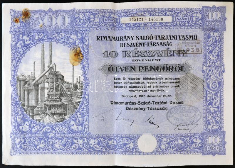 https://www.darabanth.com/en/210-Online-auction/210.0/Numismatics/Shares-and-Tickets~97/Budapest-1925-Rimamurany-Salgo-Tarjani-Vasmu-Reszveny-Tarsasag-10-reszvenye-egyenkent-~II867283