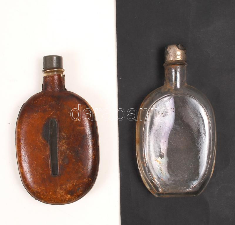 Antik üvegflaska fém csavaros kupakkal (2db), egyik bőr tokban, m:13 cm