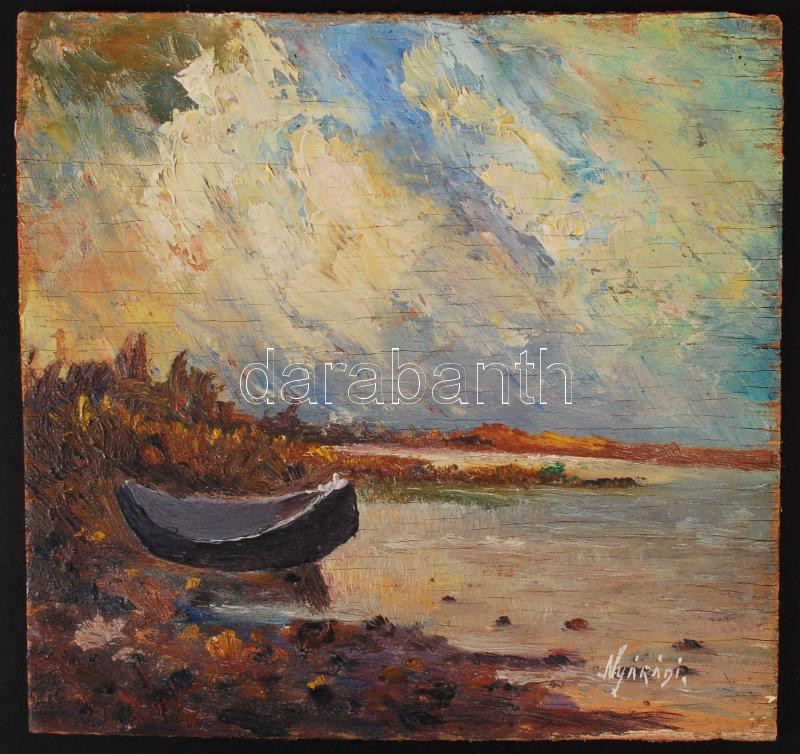 Nyárádi jelzéssel: Csónak a parton. Olaj, farost, 19×20 cm