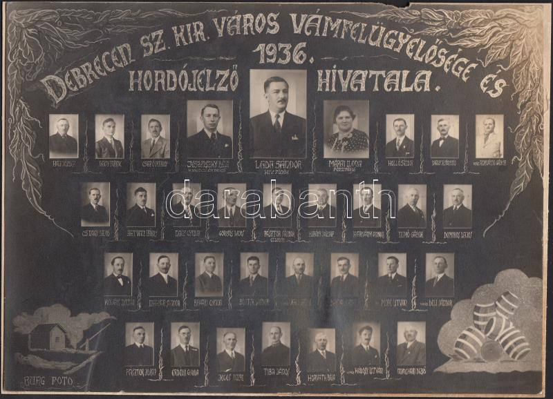 1936 Debrecen sz. kir. város Vámfelügyelősége és Hordójelző hivatala, kistabló 33 nevesített hivatalnok portréjával, 16x23 cm
