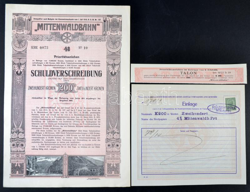 Ausztria / Innsbruck 1912. "Mittenwaldbahn" vasúti kötvény 200K-ról német nyelven betéti lappal + 1931. Szelvényutalvány 200K-ról T:I,I-