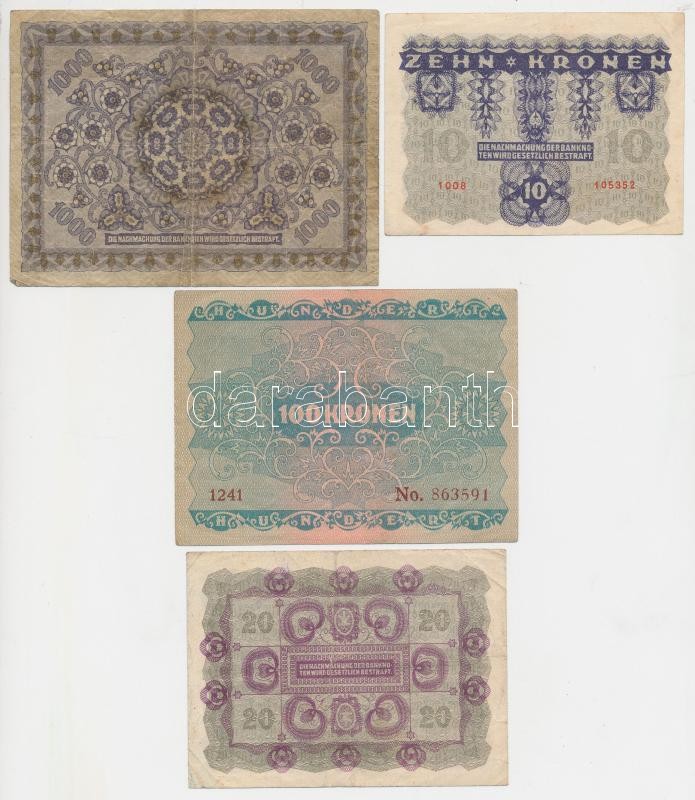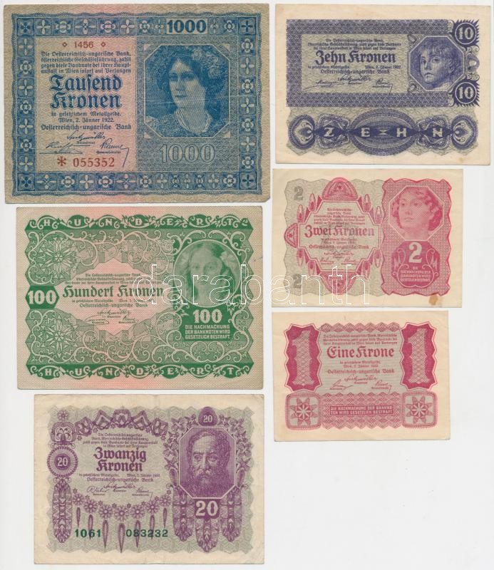1902. 1000K mindkét oldal német, "Deutschösterreich" felülnyomással + Osztrák-Magyar Bank 1922. 1K + 2K + 10K + 20K + 100K + 1000K T:II-,III,III-