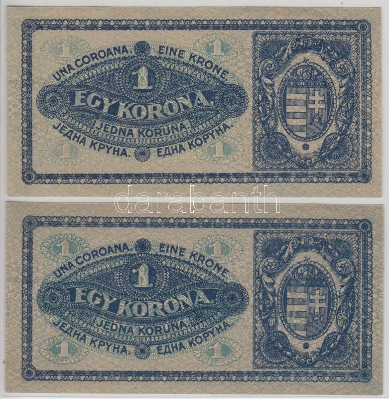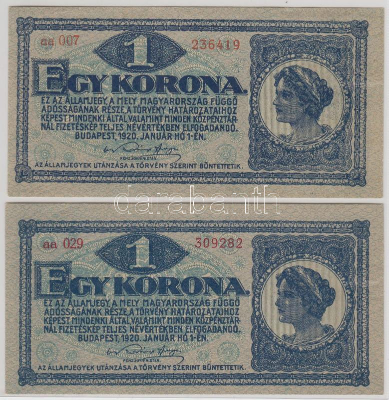1920. 1K (2x) enyhén narancssárgás és rozsdavörös sorozat- és sorszám ...