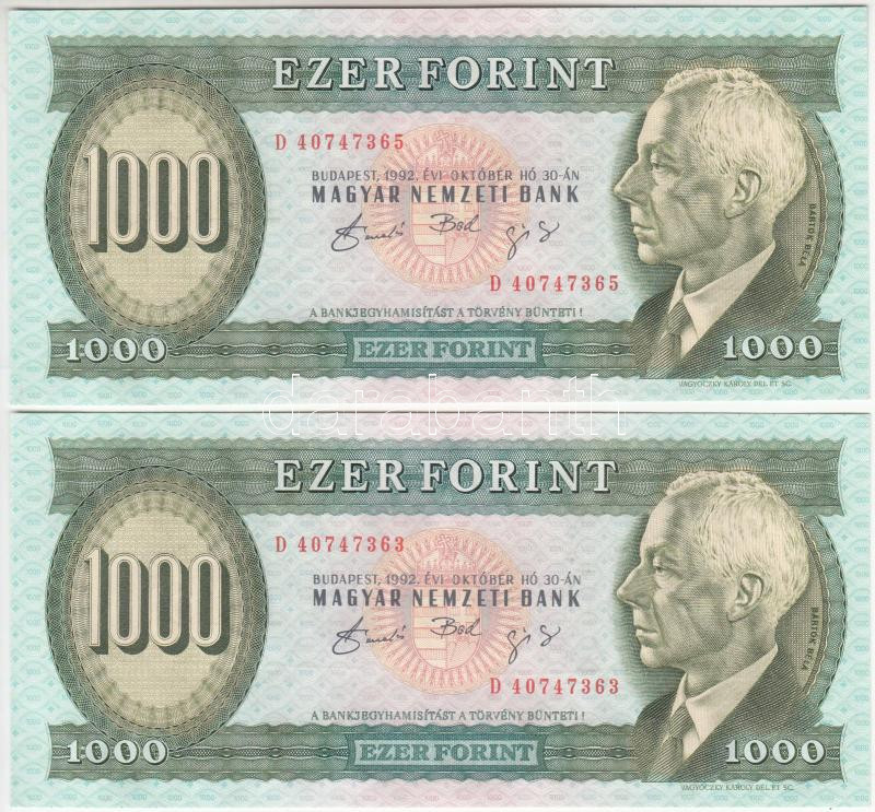 1992. 1000Ft (2x) egymáshoz közeli sorszámmal: "D 40747365", "E 40747365" T:I