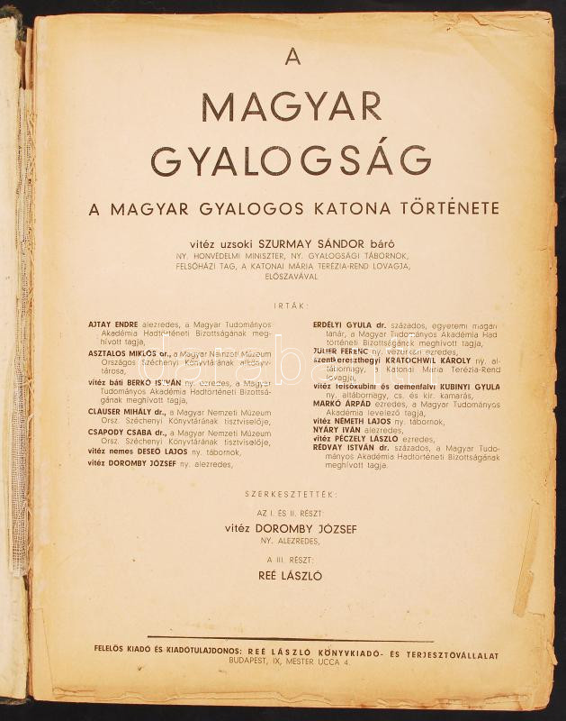 A Magyar gyalogság. A magyar gyalogos katona története. Szerk.: Doromby József - Reé László. Sérült egészvászon kötésben, egy lap sérült.