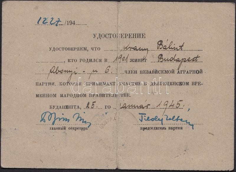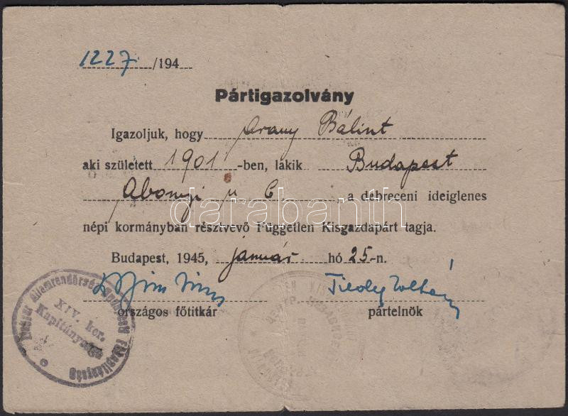https://www.darabanth.com/en/211-Online-auction/211.0/Other-collectibles/Documents~400319/1945-Bp-Fuggetlen-Kisgazdapart-altal-Arany-Balint-reszere-kibocsatott-partigazolvany-Tild~II872521
