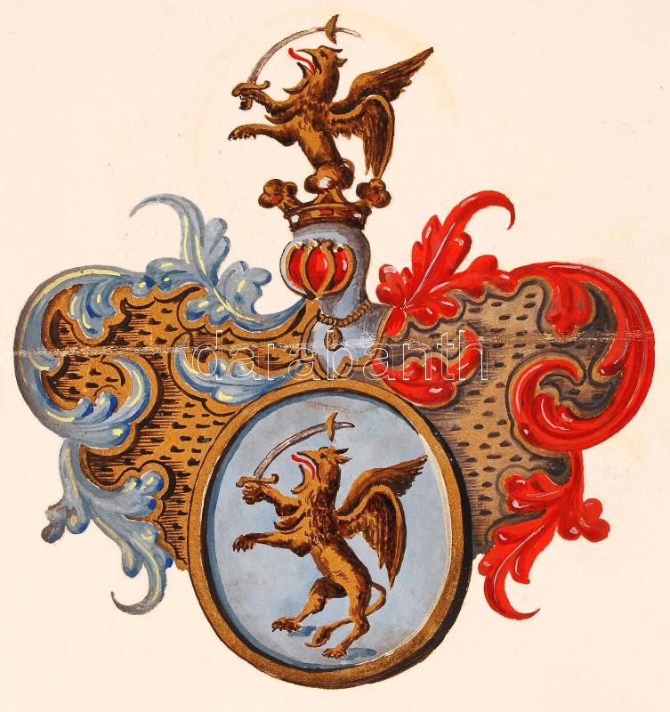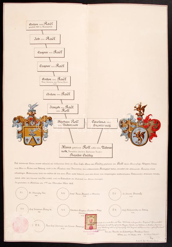 Description: 1842 Kassa, Csáky Tivadar (1798-1855) császári és királyi kamarás, Szepes vármegyei főispán feleségének, Klara Rollnak, a Csillagkeresztes-rend tagjának kézzel festett leszármazási táblája a Csillagkeresztes-rend szárazpecsétjével