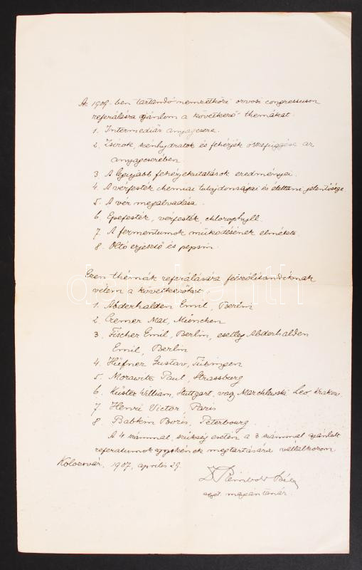 1907 Kolozsvár, Reinbold Béla (1875-1927) biokémikus, egyetemi tanár saját kézzel írt levele