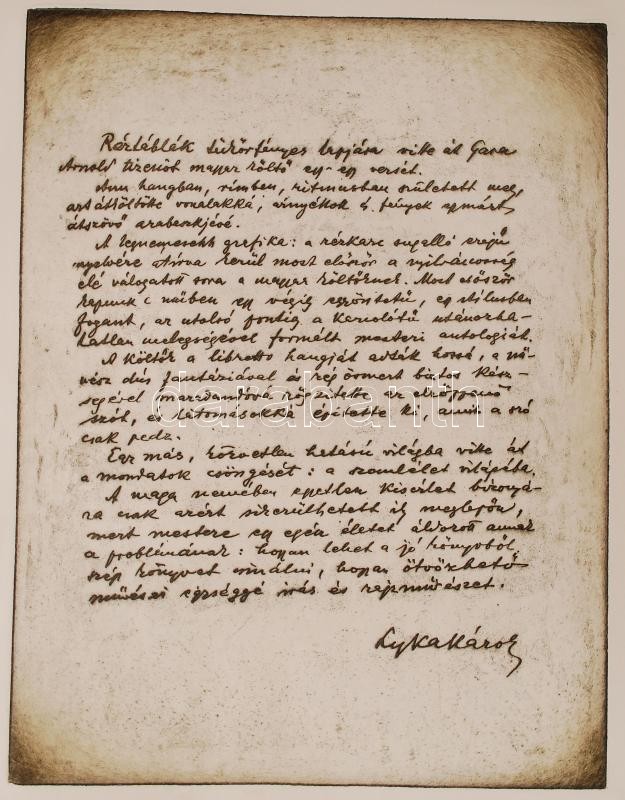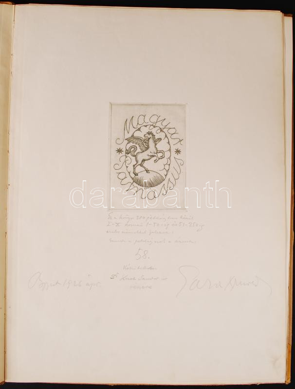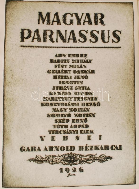 Gara Arnold: Magyar parnassus Bp., 1926. Szerzői 15. neves író-költő egy-egy verséhez készített, sajátkezűleg szignált és képaláírással ellátott rézkarcait tartalmazza. Az írók: Ady Endre, Babits Mihály, Füst Milán, Gellért Oszkár, Heltai Jenő, Ignotus, Juhász Gyula, Kemény Simon, Karinthy Frigyes, Kosztolányi Dezső, Nagy Zoltán, Somlyó Zoltán, Szép Ernő, Tóth Árpád és Turcsányi Elek. A főrészben a költők egy-egy autográf kéziratának és arcképének rézkarca, a hozzá tratozó képek nélkül! Ősszesen 17 db rézkarc. Az első levélen a kolofon olvasható, amelyet a művész sajátkezűleg, ceruzával írt. Ennek tanúsága szerint az összesen 250 példányból ez az 58-as számot viseli, Dr. Knob Sándor. Aranyozott félvászon-kötésben. Jó állapotban.