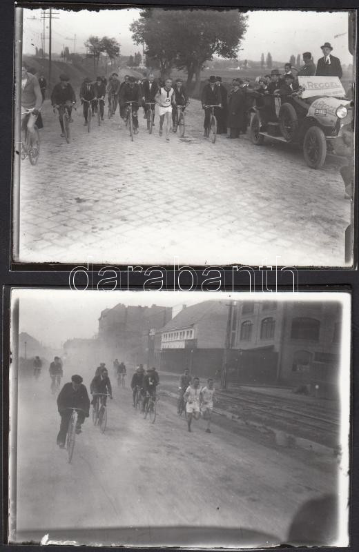 Description: cca 1918-1925 Maratoni futóverseny Budapesten, kerékpáros és autós kísérőkkel, eredeti 9x12 cm-es üveglemez negatívokról készült későbbi kontakt másolatok, 2 db, 9x12 cm