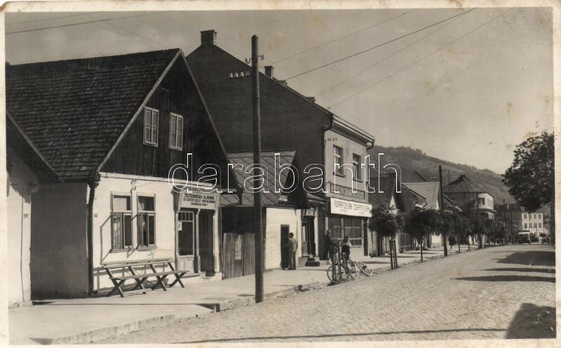 Rahó, Fő utca, Moldávcsúk Mihály szatócs üzlete, bank, Feig Bernát kia...