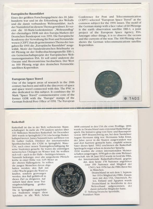 GDR 1978A 10 Mark "Common Space Flight" + Niue 1992. 5 Dollars "100 Years of Basketball" coin letter with German first day of issue stamps C:UNC,XF