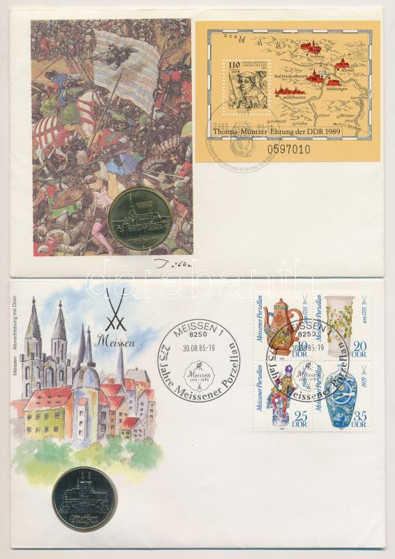 NDK 1983A 5M "Meissen" + 1989A 5M "Mühlhausen" érmés borítékon alkalmi bélyegzős bélyeggel és bélyegsorral T:1