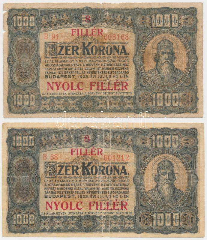 https://www.darabanth.com/en/212-Online-auction/212.0/Numismatics/Hungarian-Banknotes~200007/1923-1000K-2x-TW-nyomdahely-jelolessel-es-8-FILLER--NYOLC-FILLER-felulnyomassal-TIII~II877482