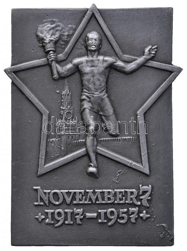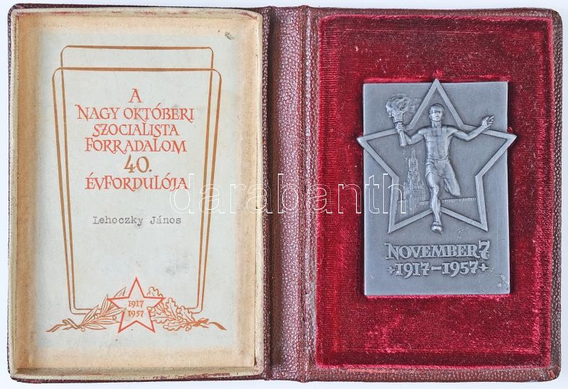 1957. "November 7. - A Nagy Októberi Forradalom 40. évfordulójára" fém emlékplakett eredeti dísztokban (49x73mm) T:2