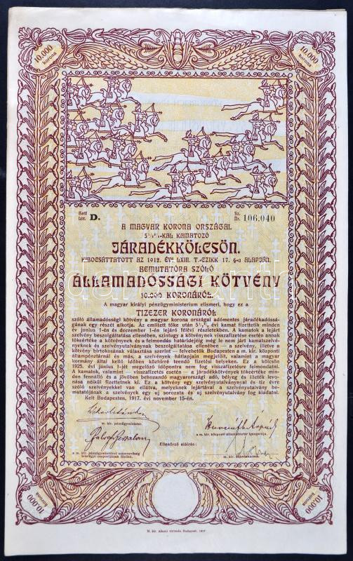 Budapest 1917. "A magyar korona országai, 5-1/2%-kal kamatozó járadékkölcsön - államadóssági kötvény" 10.000K-ról, szelvényekkel, szárazpecséttel T:II