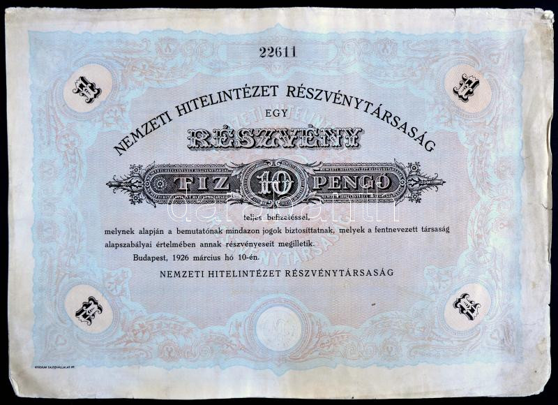Budapest 1926. "Nemzeti Hitelintézet Részvénytársaság" részvénye 10P-r...