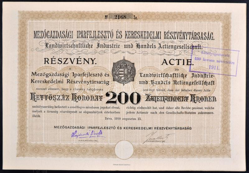 Déva 1910. "Mezőgazdasági Iparfejlesztő és Kereskedelmi Részvénytársaság" részvénye 200K-ról, szelvényekkel, szárazpecséttel és felülbélyegzéssel T:I