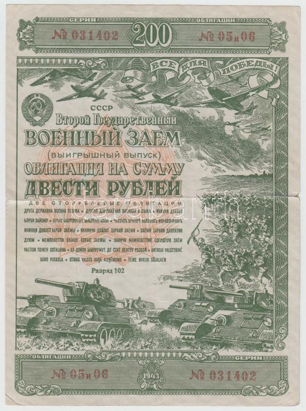 Szovjetunió 1943. háborús hadikölcsönkötvény 200R-ről T:III