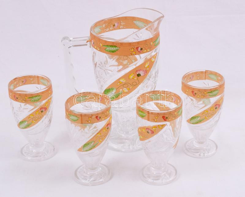 Kiöntő 4 db pohárral, matricás díszítéssel, hibátlan, kiöntő:22 cm, pohár:13 cm