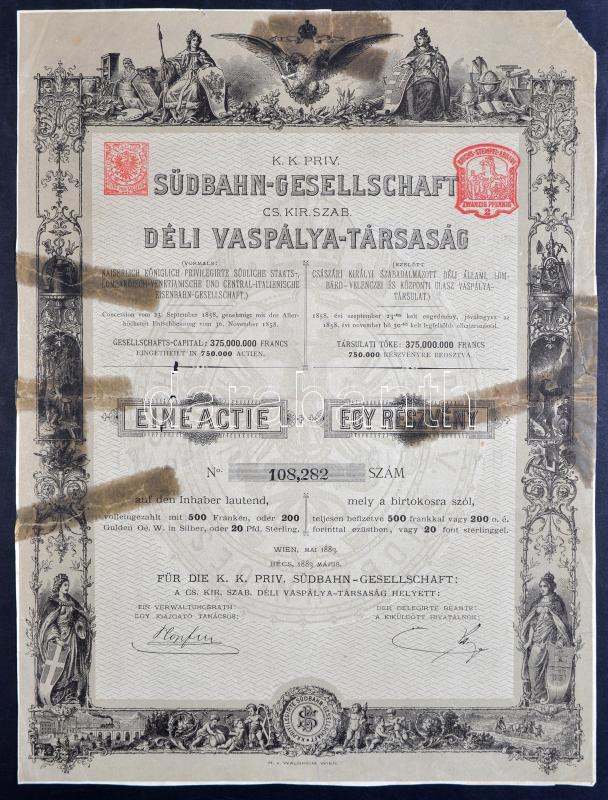 Ausztria/Bécs 1883. "Déli Vaspálya-Társaság" részvénye 500Fr-ról, felü...