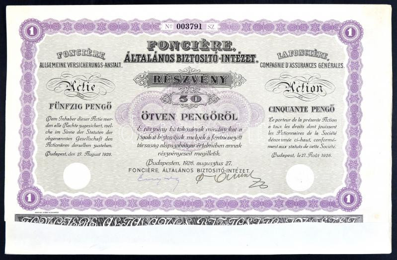 Budapest 1926. "FONCIÉRE Általános Biztosító-Intézet" Részvénye 50P-ről, magyar, német és francia nyelven T:I-